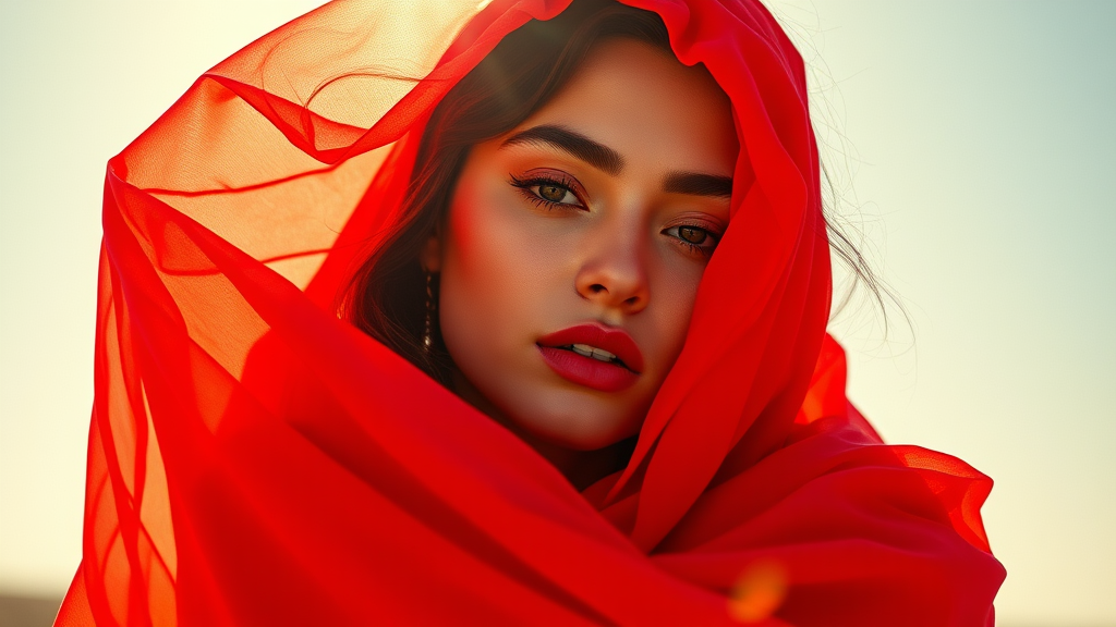 A vibrant photograph of a stunning Instagram fashion model wrapped in crimson fabric, captured in an artistic style reminiscent of colorful geometrics with influences from Guy Aroch and Helene Knoop. The composition features glowing pastels and bold lines, infused with bright, sunlit hues. Shot on a Fujifilm X-T4 with a Sony FE 85mm lens, the image radiates a dynamic energy, with a portrait orientation of 900:1600. The aesthetic blends natural realism with a touch of surrealism, emphasizing a raw and immersive visual experience.
