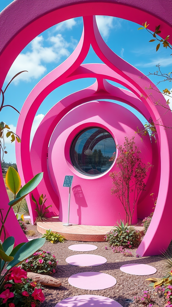 A vibrant pink circular pavilion featuring a central circular window, adorned with gracefully flowing pink arches, set within a psychedelic landscape. This captivating structure boasts colorful, biomorphic design elements reminiscent of a surreal garden. Inspired by Verner Panton, it seamlessly blends vegetal architecture with a pink zen motif. As an outdoor art installation, it exemplifies high-quality architectural artistry through its elegantly curving geometric arches crafted from pink concrete. This beautiful aesthetic, rich in organic architecture, reflects the visionary creativity of Lee Loughridge, offering a mesmerizing and immersive experience.
