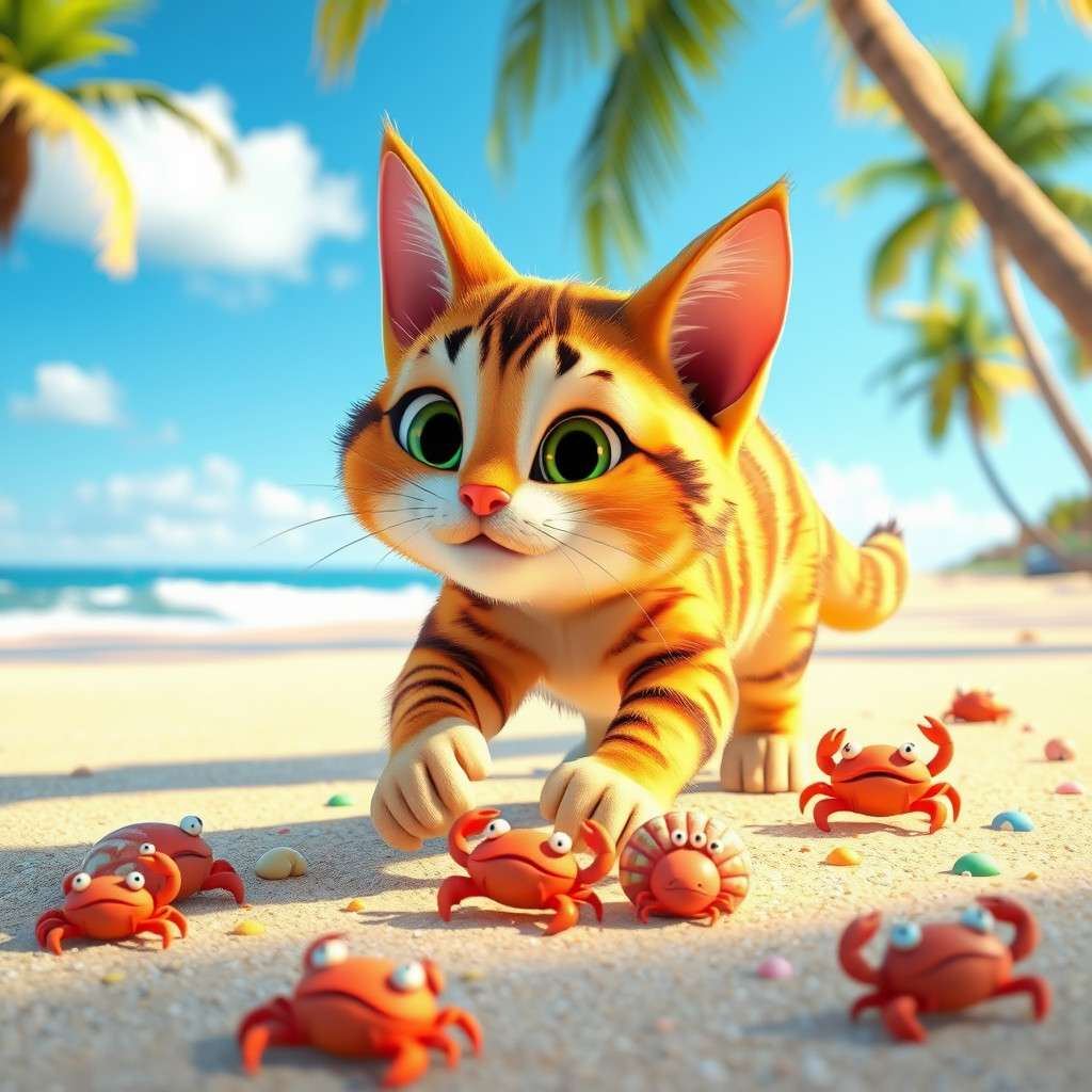 A vibrant Pixar-style 3D render of a curious tabby cat playfully exploring a sun-drenched beach, featuring animation reminiscent of "Finding Nemo." The cat's expressions are irresistibly cute, perfectly synchronized with its animated movements as it chases after colorful, oversized seashells and interacts with tiny, whimsical crabs. The scene is saturated with bright hues, with a touch of cartoonish flair, as palm trees sway gently in the background and the ocean sparkles under a clear blue sky.