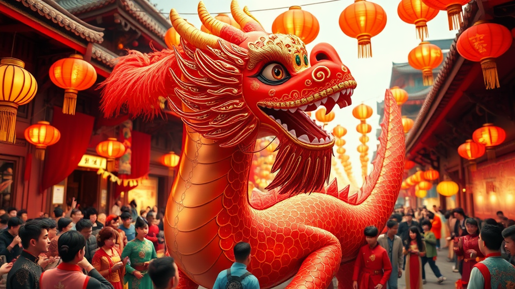 A vibrant Pixar-style animation scene featuring a majestic red dragon celebrating the lunar new year, adorned with intricate traditional Chinese costumes blended with subtle Victorian-inspired design elements. The setting bursts with joyful chaos, showcasing lively street festivities filled with revelers in colorful attire. The dragon's scales reflect a shimmering array of red and gold, interwoven with intricate patterns symbolizing prosperity and good fortune. The scene is filled with an air of excitement and cultural richness, with vibrant lanterns and firecrackers illuminating the celebration, capturing the essence of tradition and modernity.