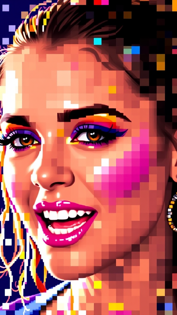 A vibrant, pixelated portrayal of a well-known pop singer, her facial features transformed into a mosaic of colorful digital blocks, capturing the energy and dynamism of her persona in a uniquely abstract style.
