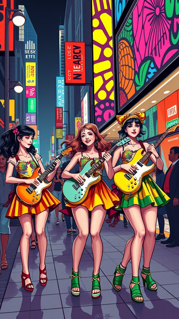 A vibrant Pop Art depiction of three girls energetically playing music on a lively street corner, their colorful instruments lighting up the scene. The background is filled with bold patterns and dynamic shapes, capturing the pulsating rhythm of the city. Each girl is dressed in eye-catching outfits with exaggerated colors and designs, their expressions full of joy and intensity. The medium aspect ratio highlights the bustling energy around them, with passersby transformed into stylized silhouettes, creating a vivid tapestry of urban life.