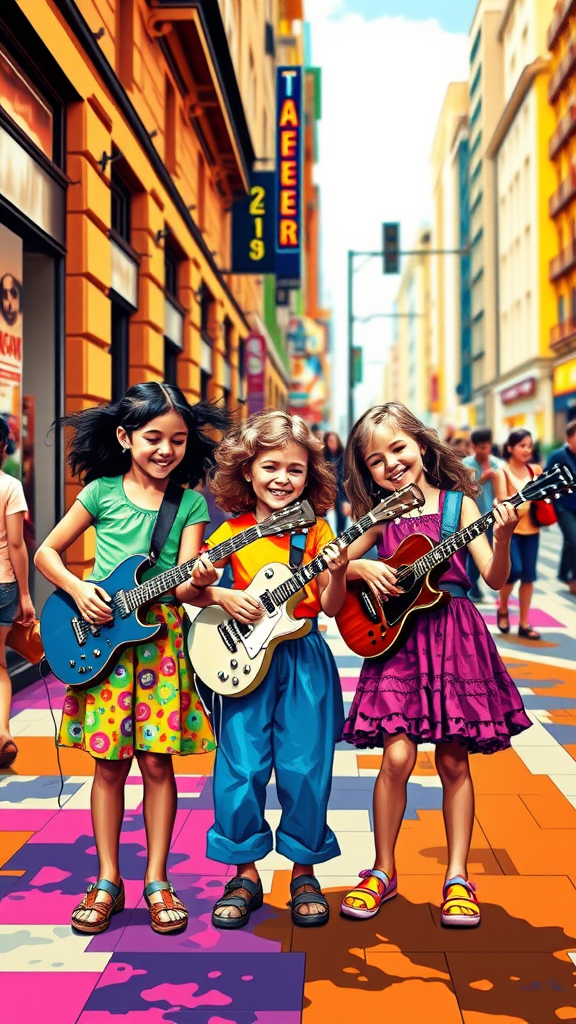 A vibrant Pop Art scene depicting three young girls animatedly playing instruments on a bustling street corner, their colorful outfits contrasting with the urban backdrop. Bold, dynamic colors give life to the image, with expressive facial expressions capturing their joy and camaraderie. The street is transformed into a lively mosaic of patterns and textures, with exaggerated shadows and highlights creating a sense of movement and energy, while passersby in the background are rendered in stylized silhouettes.