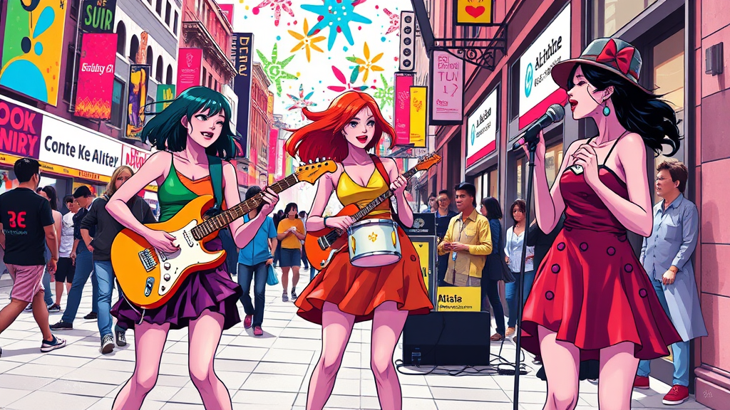 A vibrant pop art scene depicts three girls energetically playing music on a bustling street, their colorful, abstract forms pulsating with rhythm. Each girl wields a different instrument, adding layers to the dynamic symphony; one strums a guitar, another beats a drum, while the third sings passionately into a microphone. The background is a lively explosion of bold patterns and bright hues, capturing the spirit of the urban setting and the joyful essence of their performance. Passersby stop to watch, their silhouettes blending into the vivid tapestry of colors that electrify the scene.