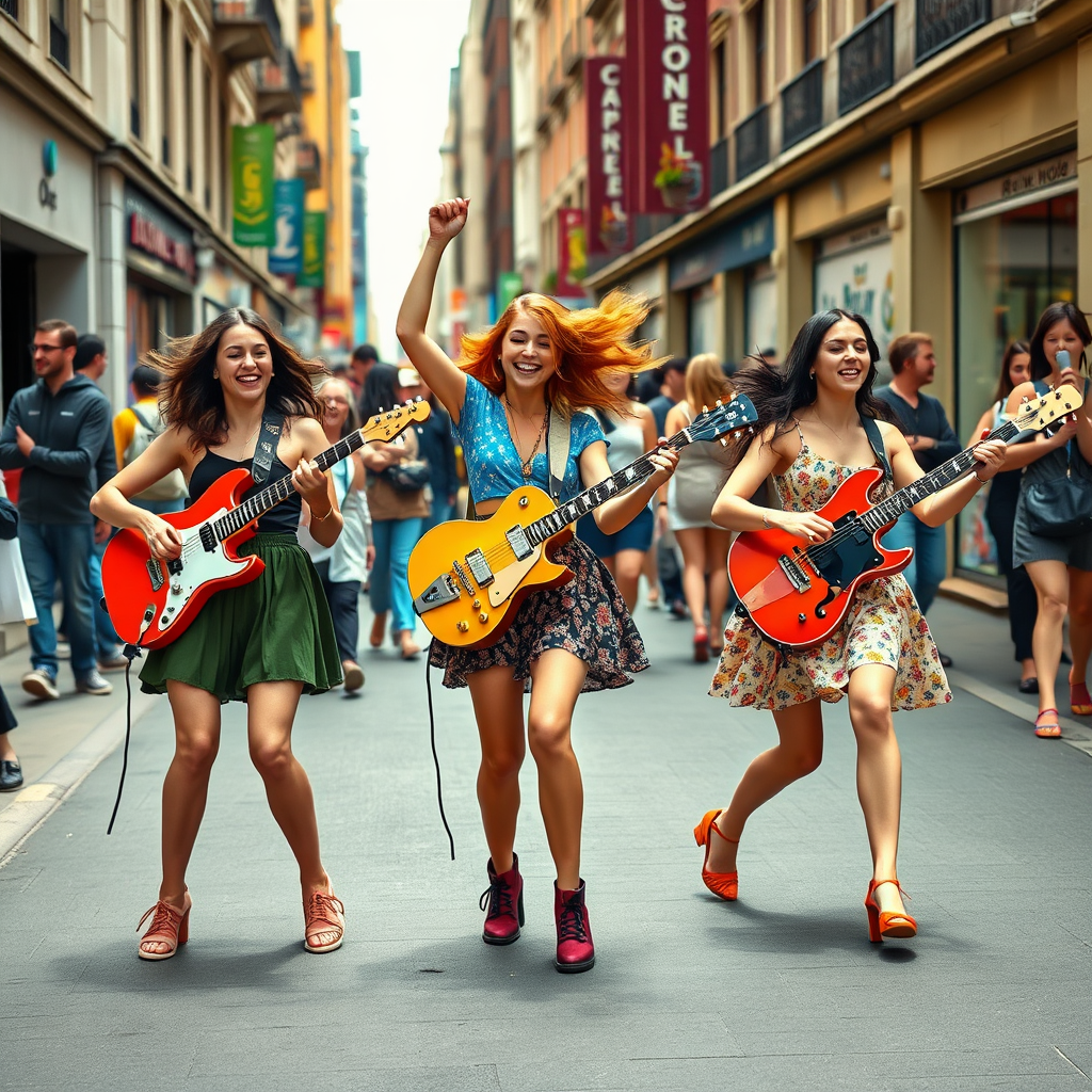 A vibrant Pop Art-style image depicting three young women energetically playing musical instruments on a lively street, their colorful outfits and dynamic poses reflecting the rhythm and energy of their performance. The bold, contrasting colors and graphic elements capture the essence of urban life, with onlookers in the background adding to the bustling atmosphere. The medium aspect ratio frames the scene perfectly, emphasizing the joy and spontaneity of street music.