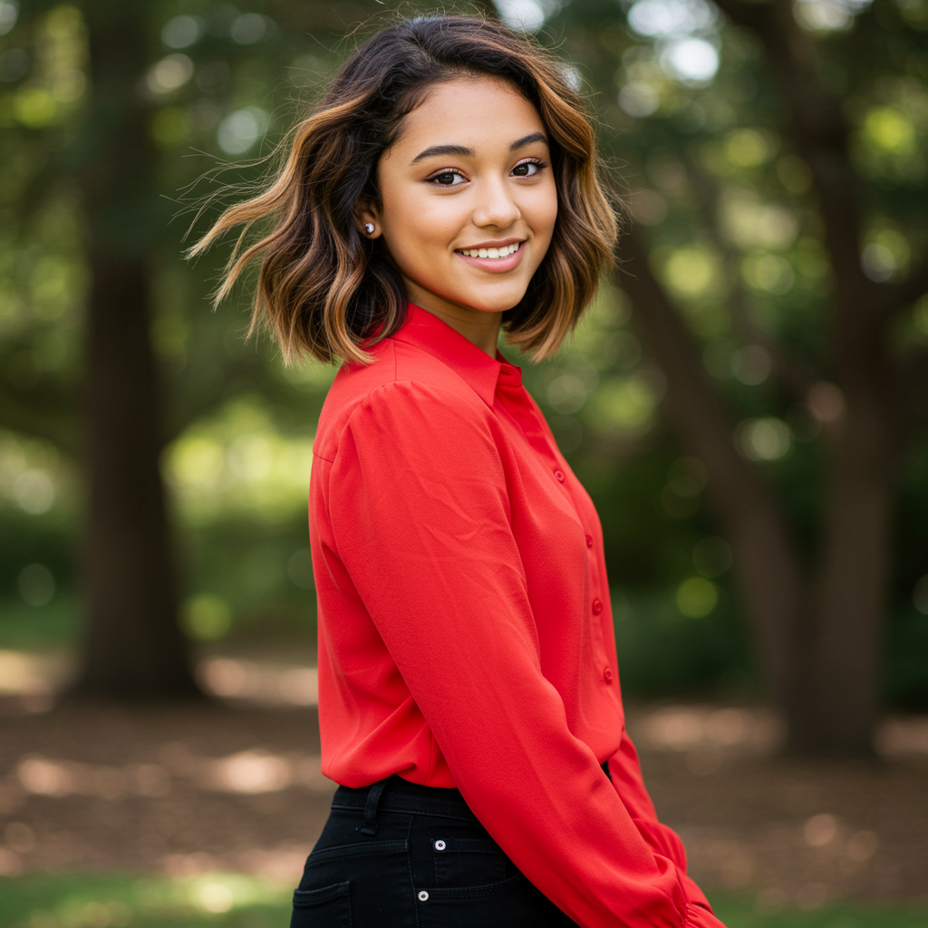 A vibrant portrait captures a young, beautiful girl of mixed heritage, her skin glowing with natural warmth. Her medium-length bob hairstyle dances gently with the breeze, featuring rich brunette tones interwoven with sunlit blonde highlights. She wears a vivid red blouse that contrasts elegantly with her sleek black jeans, complementing her poised, confident demeanor. The outdoor setting is lush and inviting, with soft sunlight filtering through the trees, casting playful shadows that accentuate her expressive eyes and radiant smile.