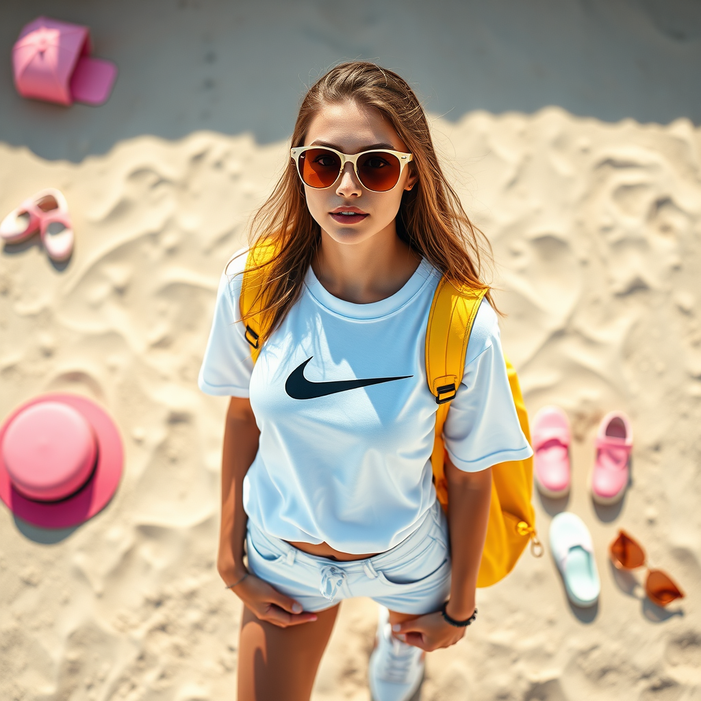 A vibrant portrait capturing an American fashion girl in a full-body shot at the beach. She sports stylish sunglasses and a classic white T-shirt adorned with a Nike logo, paired with fresh white sneakers. Her ensemble is completed by a striking yellow backpack. The image is rendered in high-definition 8k, offering a photorealistic quality. Shot from above, it incorporates a fascinating knolling arrangement of beach essentials, with the main color theme centered around a playful pink hue (#ff7ad2). The composition integrates a thoughtful data visualization, providing a dynamic and modern aesthetic.