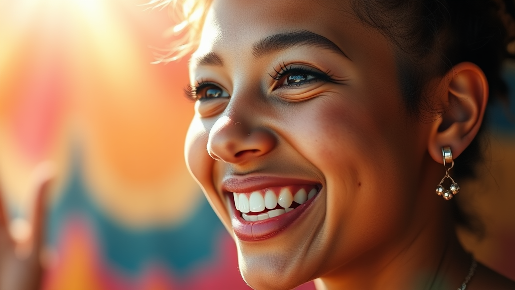 A vibrant portrait capturing the essence of joy and warmth, with sunlight gently caressing the skin. The scene is filled with cheerful laughter, creating an atmosphere where life feels truly wonderful. The background is an explosion of stunning gradient colors, rendered in exquisite detail. The subject's earrings catch the light, adding a touch of sparkle, while a slightly dirty face tells a story of playful adventures. The composition focuses on the expressive eyes and unique nose, with a pleasing cropped framing that highlights the emotions. Despite a few low-resolution elements that add charm, the overall image avoids blurriness, text, or any identifying marks. A touch of surrealism brings unexpected verticality to the neck, enhancing the portrait's captivating allure.