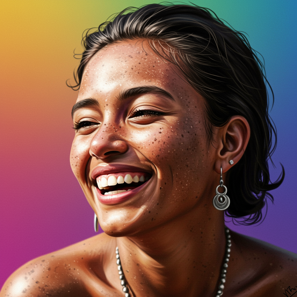 A vibrant portrait capturing the essence of joy and warmth, featuring sunshine gently illuminating the subject's skin and the sound of joyful laughter resonating in the air, encapsulating a sense of blissful contentment. The background showcases stunning gradient colors in vivid detail, creating an immersive experience. The subject has a slightly dirty face with captivating earrings adding to the intricate details. The composition is focused and clear, with no traces of low resolution or digital artifacts, and there are no signatures or watermarks to distract from the artwork. The result is a harmonious blend of vivid colors and emotions, celebrating the beauty of life's simple pleasures within a detailed and breathtaking scene.