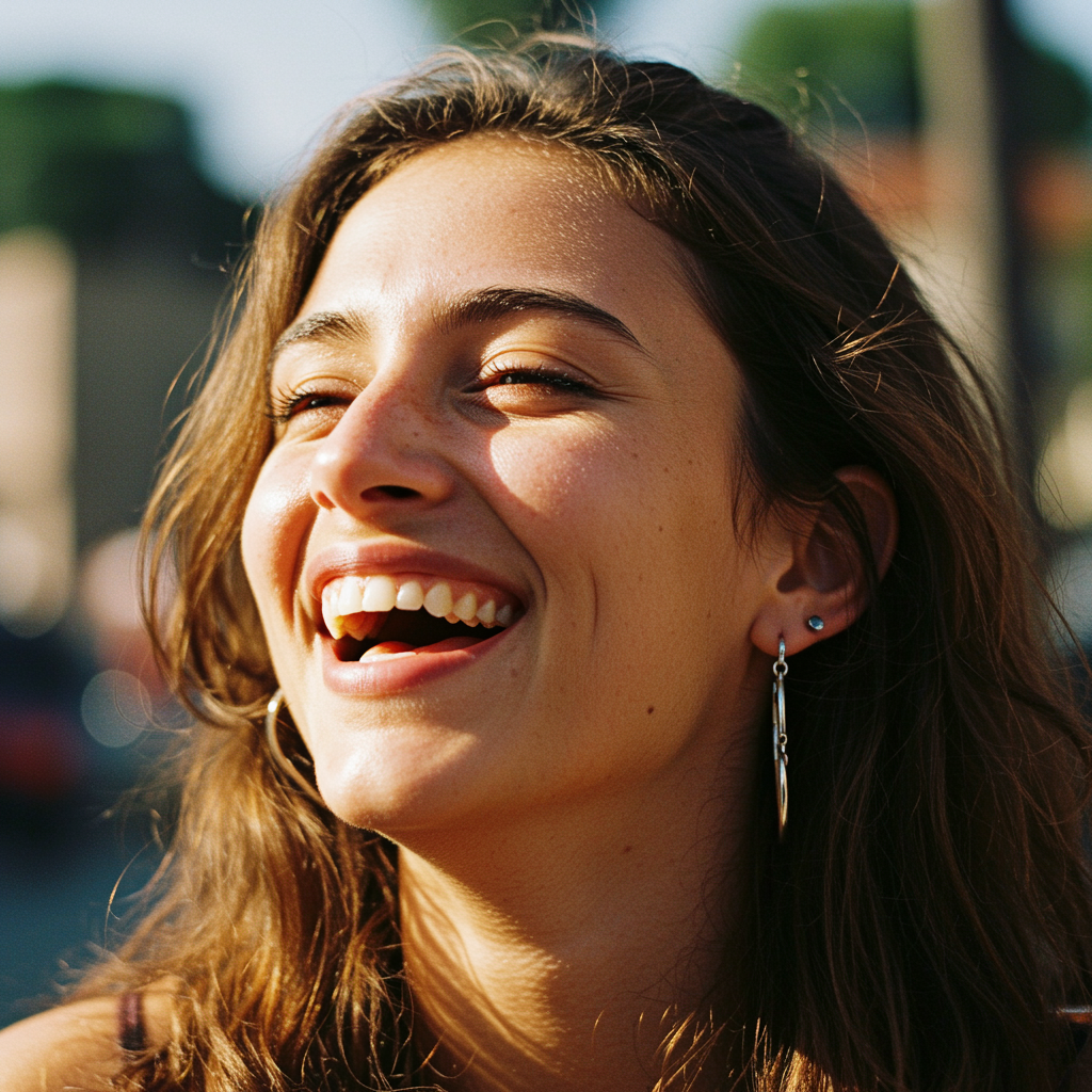 A vibrant portrait capturing the essence of sunlight on skin, evoking joyful laughter and a sense of well-being. The scene is alive with stunning gradient colors and a detailed background, showcasing a lively and exuberant atmosphere. Elements of HDR quality, featuring distinct earrings and subtle imperfections on the face, contribute to the character's authenticity. The composition highlights a unique perspective with a focus on expressions, while maintaining a clear, high-resolution image free from any distracting artifacts or signatures. The portrait celebrates individuality with a distinctive presence and elongates features for a captivating effect.