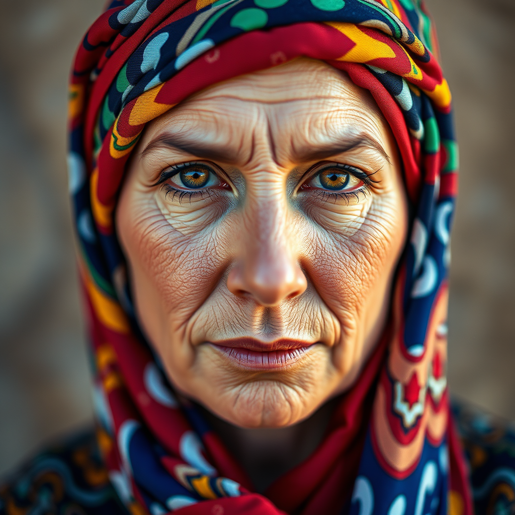 A vibrant portrait of a Bosnian woman wearing a colorful keffiyeh, captured with an epic character composition that blends the styles of Ilya Kuvshinov, Terry Richardson, and Annie Leibovitz. The image is in sharp focus with natural lighting that highlights subtle subsurface scattering. Shot with an f2 aperture and 35mm lens, it features a cinematic film grain effect, creating an award-winning, high-resolution photograph. Despite its stunning quality, the image playfully incorporates elements of imperfection and attitude, exuding a sense of rebellious charm.
