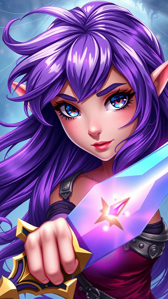 A vibrant portrait of a captivating elf girl with flowing purple hair, wielding a gleaming sword. Her eyes, filled with mystery and strength, draw you in, set against a fantasy backdrop. Inspired by the styles of rossdraws and wlop, the artwork merges stunning character art with a cartoon-like vibrancy. The digital painting showcases intricate details reminiscent of artgerm and julie bell, while evoking the dynamic energy of beeple's creations. This striking piece captures the essence of adventure and magic in a world beyond imagination.