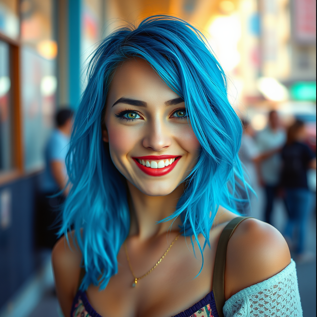 A vibrant portrait of a captivating woman with striking blue hair and a radiant smile, depicted in the animated gif style showcasing fleeting, candid moments filled with blink-and-you-miss-it details. Captured with a Provia-like vibrancy, reminiscent of the artistic flair of Inessa Garmash and Natalia Rak, with a colorized touch. The image presents a raw and authentic feel, set within a slender, elongated aspect ratio of 51:109, with an added touch of creative spontaneity.