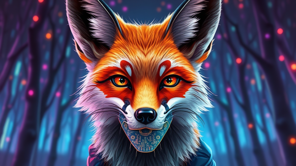 A vibrant portrait of a futuristic fox with sleek, metallic fur, its eyes gleaming with intelligence and curiosity. The fox wears a stylish, translucent mask over its mouth, revealing intricate circuitry patterns. In the background, a digital forest of pixelated trees and neon lights creates an otherworldly atmosphere, enhancing the modern and enigmatic allure of this digital creature.