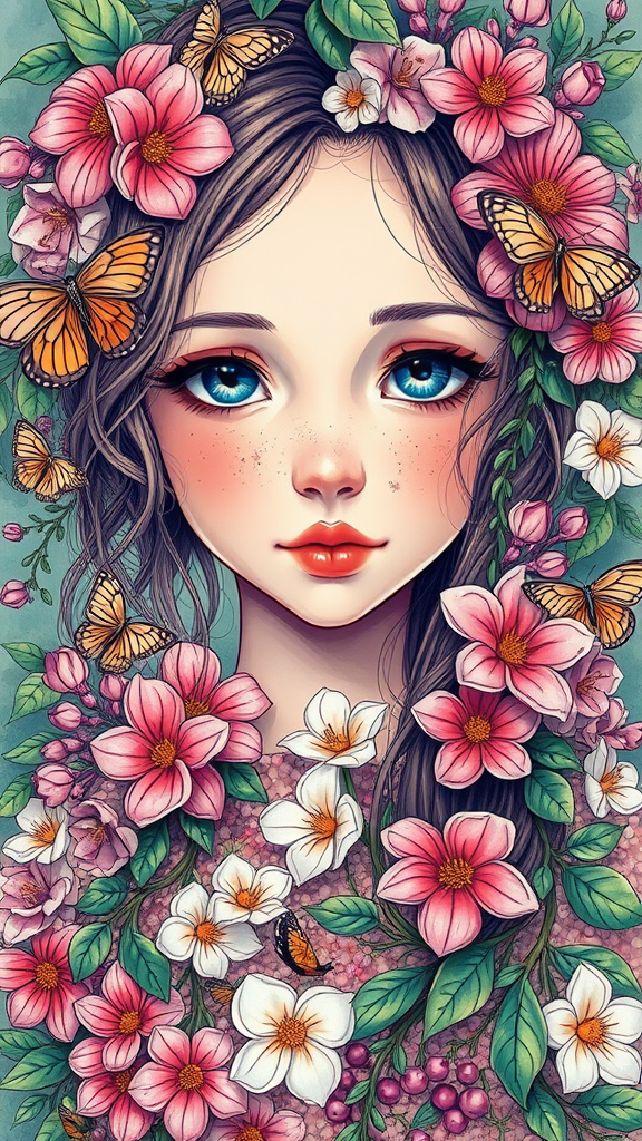A vibrant portrait of a girl adorned in a dress made entirely of blooming flowers, depicted in Artgerm's style with loose linework that captures the lush details of the petals and vines. Her face features intricate details with soulful eyes and a serene expression, embodying the essence of cottagecore. Nature-inspired elements surround her, with butterflies and gentle foliage adding to the enchanting scene. The intense close-up composition emphasizes the harmonious blend of human and nature, evoking a sense of tranquility and beauty.