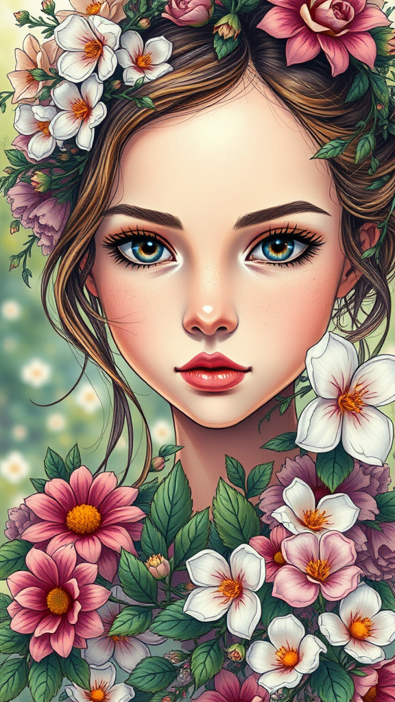 A vibrant portrait of a girl adorned with an intricate gown of blooming flowers, depicted in the style of Artgerm with expressive loose linework. The image showcases lush, detailed elements with a focus on her expressive facial features. The scene embodies a cottagecore aesthetic, drawing inspiration from the serene beauty of nature. Her eyes capture an intense yet gentle gaze, framed by tendrils of greenery woven into her hair, creating a harmonious blend of human and floral elegance against a softly blurred natural background.