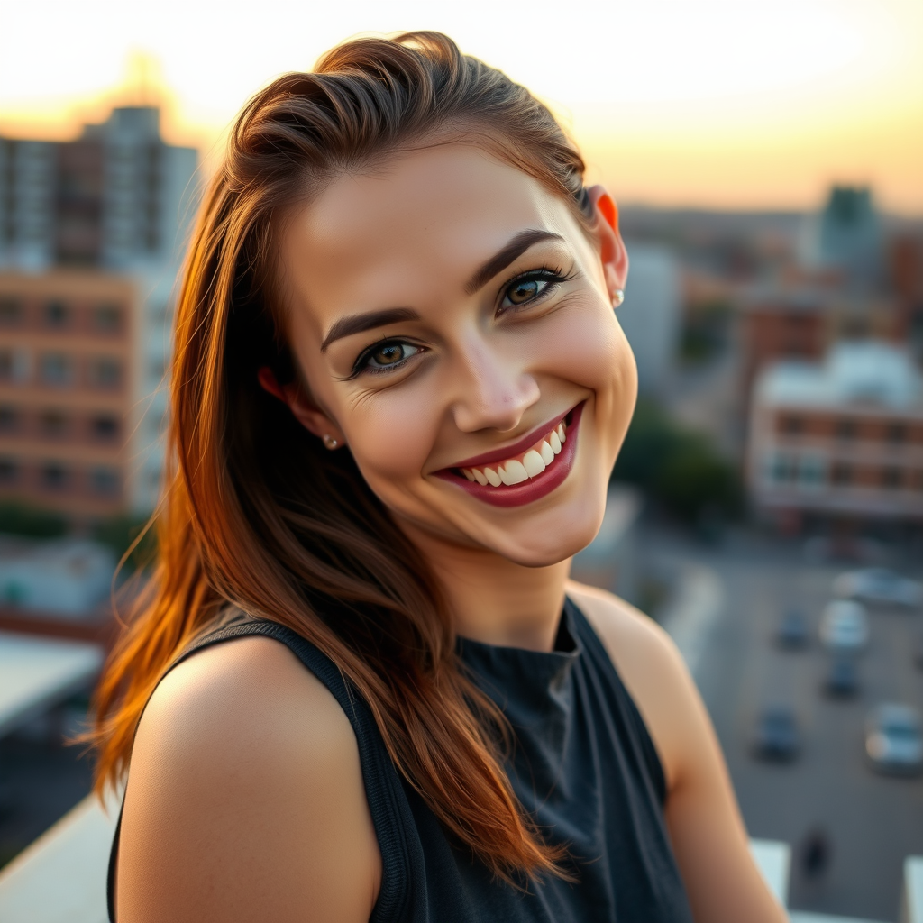 A vibrant portrait of a joyful woman with damp, slicked-back chestnut hair cascading over one shoulder. She gazes warmly at the camera, her head subtly tilted in a friendly manner. Clad in a sleeveless charcoal top, her natural makeup accentuates her features elegantly. The backdrop is an urban landscape bathed in the golden hues of sunset, adding a touch of warmth to the scene.
