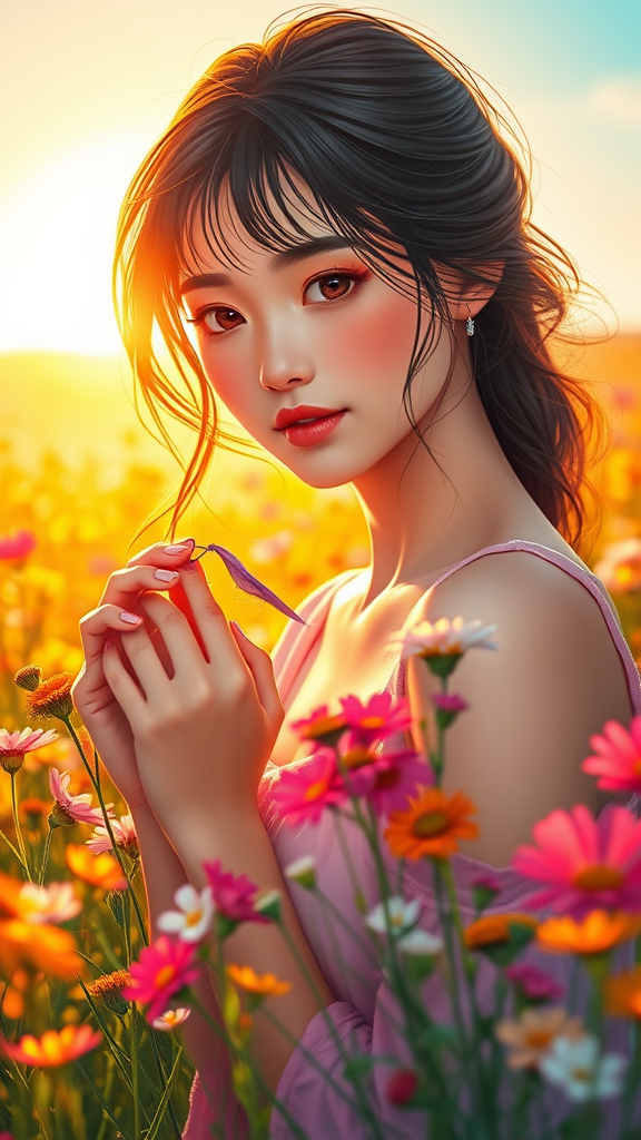 A vibrant portrait of a stunning young woman gathering flowers in a sunlit meadow, her graceful movements capturing the essence of a summer morning. Her delicate fingers gently grasp colorful blossoms as the golden dawn light plays upon her features, infusing the scene with warmth and tranquility. Her expression is serene, embodying a deep connection with nature, while the surrounding landscape is a blur of vibrant hues and soft pastels. The artistic style has a whimsical, anime-inspired charm, emphasizing the beauty and harmony of the moment.