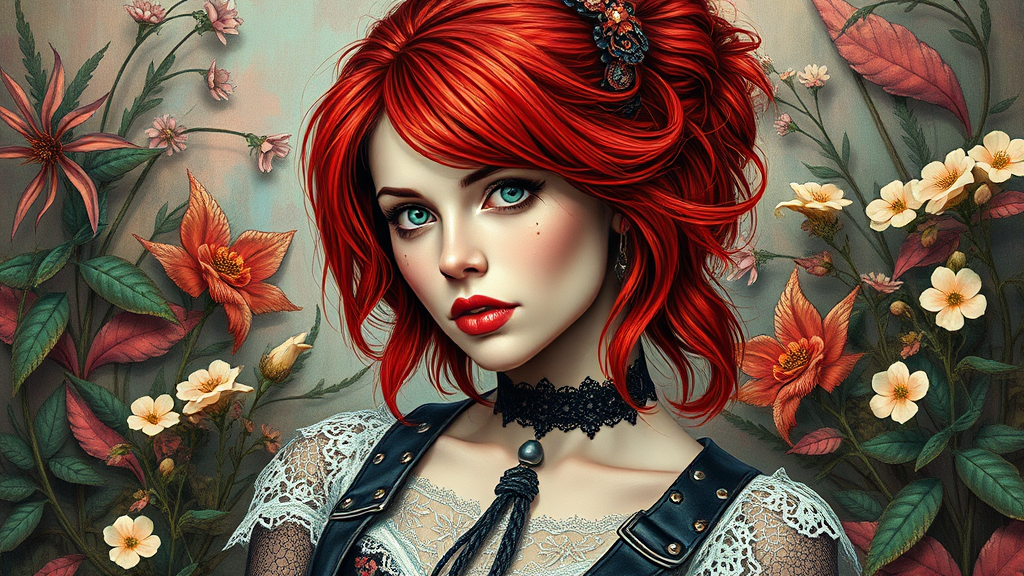 A vibrant portrait of a Victorian 80s punk woman with striking red hair, set against a background infused with pastel colors, surrounded by lush plants and delicate flowers. The artwork embodies a mix of rebellion and elegance, capturing the spirit of a bygone era with a modern twist. The woman's expression is fierce yet elegant, her attire a blend of Victorian-style lace with punk leather accents, creating a unique harmony between tradition and subversion. Inspired by the artistic style of Tom Bagshaw, the scene is rich in detail and character, yet infused with boldness and creativity.