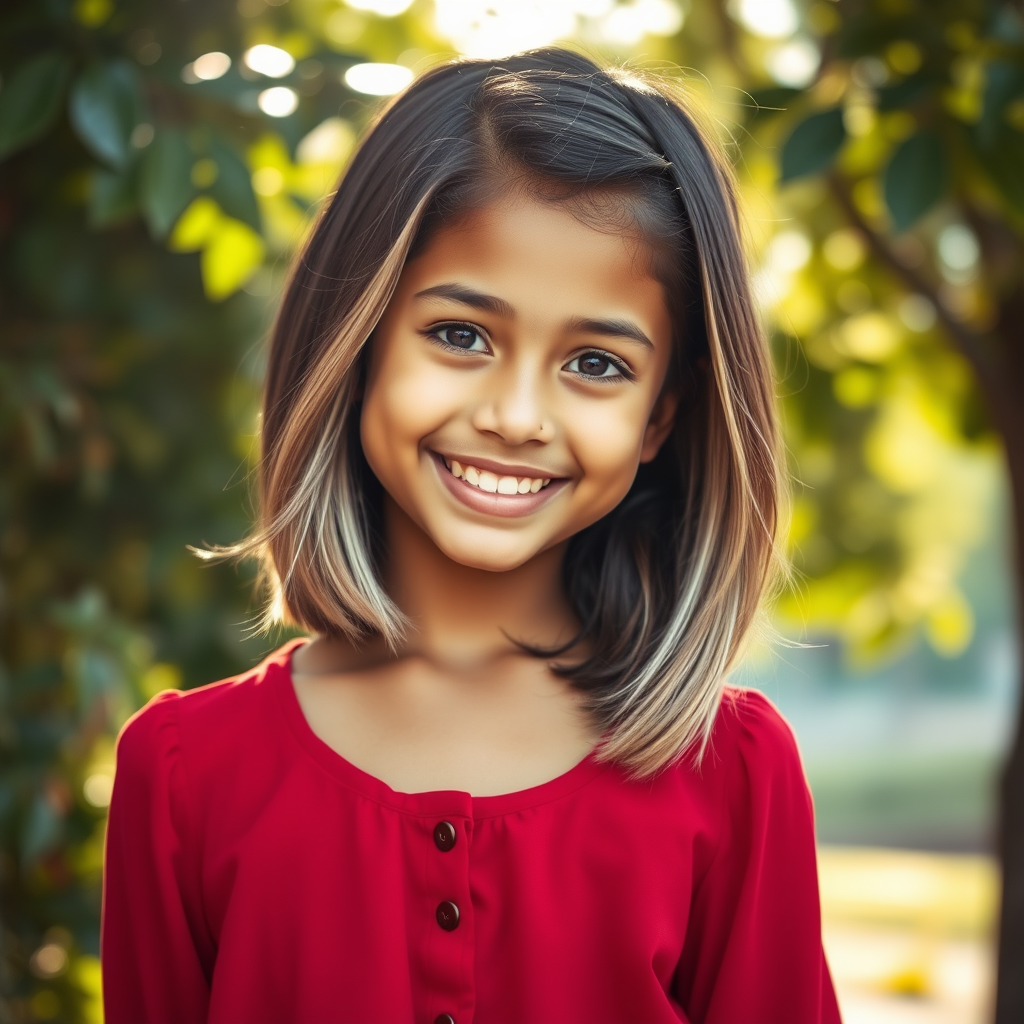 A vibrant portrait of a young, stunning girl of mixed heritage with a radiant smile. Her complexion is a blend of soft natural tones, reflecting a healthy glow. Her medium-length bob haircut flows gracefully, showcasing her rich brunette locks accentuated by subtle blonde highlights. She's dressed casually in a stylish red blouse paired with dark denim jeans. The backdrop captures an outdoor scene, with lush greenery and soft sunlight filtering through the leaves, illuminating her in gentle, warm tones.