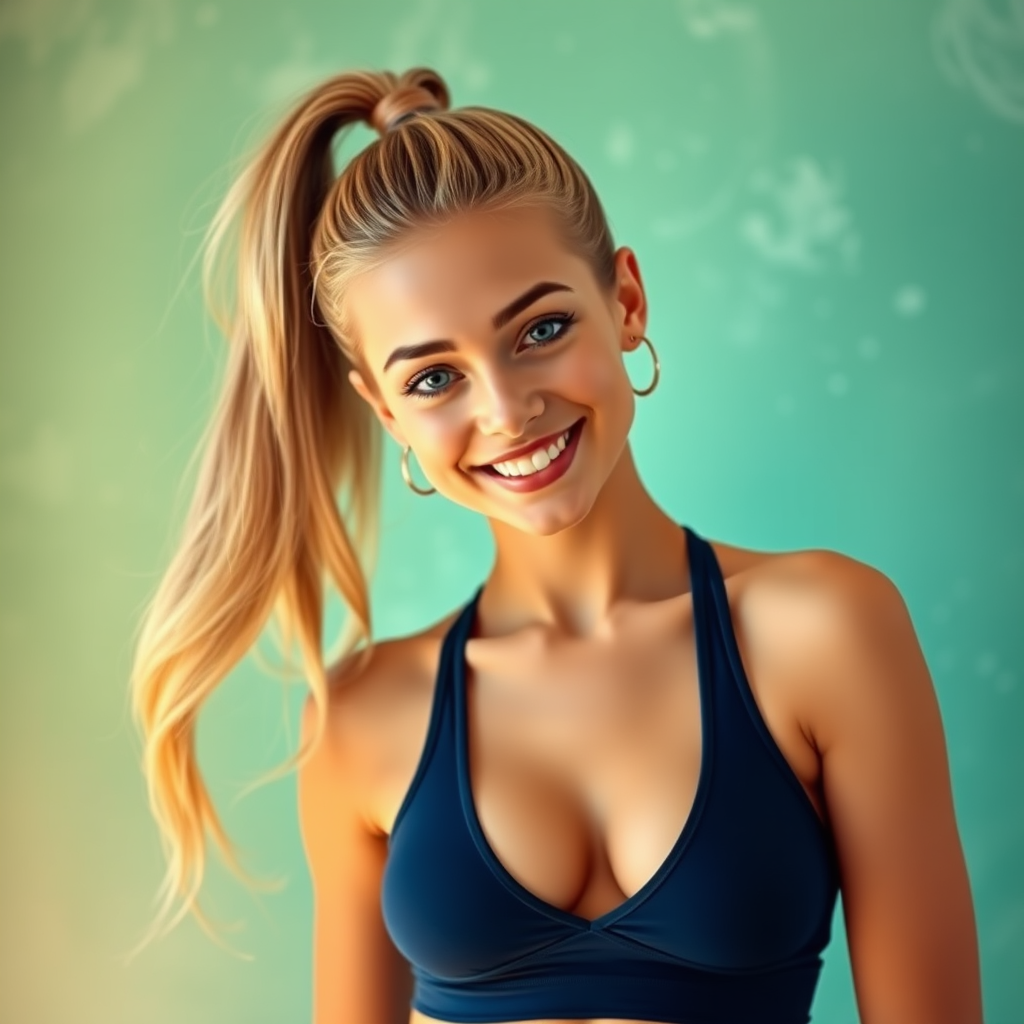 A vibrant portrait of a young woman with long, sun-kissed blonde hair cascading in a loose, high ponytail. Dressed in a sleek navy blue sports bra, she stands slightly angled to the right, grinning cheekily at the viewer. The backdrop is a mottled seafoam green wall, enhancing the warmth of the soft, ambient lighting that accentuates her expressive features and toned physique. This image radiates an energetic, relaxed, and self-assured atmosphere in a naturally illuminated setting.