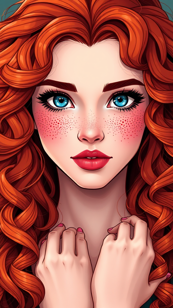 A vibrant portrait of an incredibly striking young woman with porcelain-like skin, resembling a 25-year-old version of Merida. She has captivating blue eyes with a scattering of freckles and full, inviting lips. Her fiery red hair forms a cascade of unruly curls around her face. Created in a distinctive graphic manhwa art style, the image is of exceptional quality, rendered in UHD, HDR, and 8K resolution. The composition utilizes Model: Dark Sushi 2.5D features. The elements are harmoniously aligned to avoid duplication, distortion, or any form of disfigurement. Her eyes are expressive and symmetrical, complemented by a gracefully proportioned neck and elegantly shaped hands. The artwork is free from blurriness, compressed artifacts, or intrusive elements like watermarks, logos, or text, ensuring clarity and focus on her unique features.