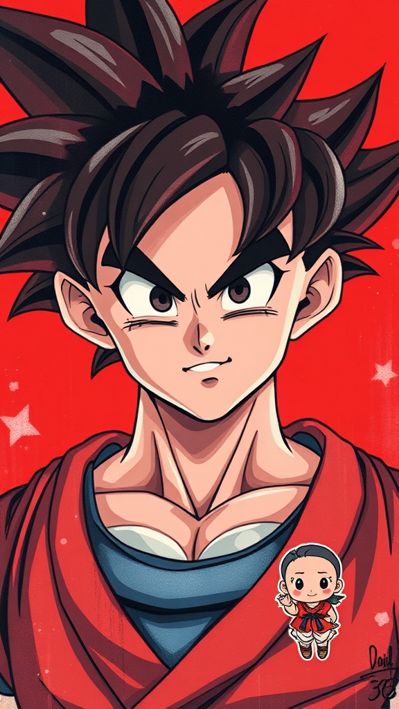 A vibrant portrait of Dr. Goku, inspired by Dragon Ball, blending street art aesthetics with cute cartoonish elements. This piece combines photo-realistic techniques with a dark red palette, reminiscent of childhood arcadias. It features anime aesthetics and playful cartoon-like figures, capturing the essence of both fantasy and realism in a harmonious mix.