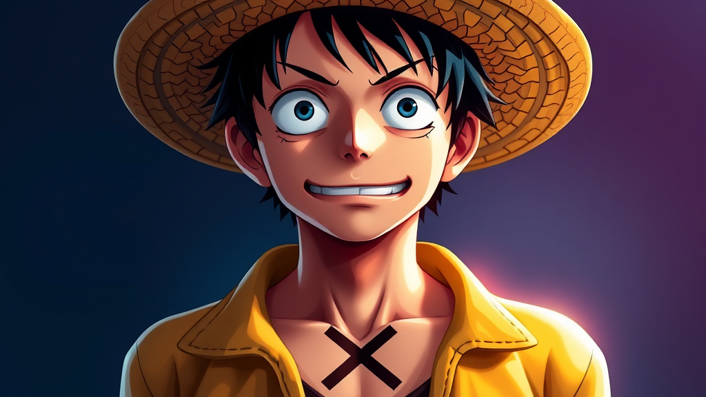 A vibrant portrait of Monkey D. Luffy from the One Piece anime, showcasing his iconic X-shaped scar on his chest. He wears his signature Straw Hat and exudes a confident aura. The composition features a symmetrical body with cinematic lighting that creates a high contrast, emphasizing his adventurous spirit. Inspired by character concept art, the image captures the essence of Luffy with subtle creative modifications, all in a stunning 8K resolution, reminiscent of an ArtStation masterpiece.