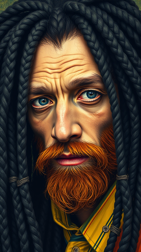 A vibrant portrait of Van Gogh reimagined, featuring a dynamic expression framed by a cascade of intricate black dreadlocks, capturing his intense gaze and artistic spirit with a modern twist.