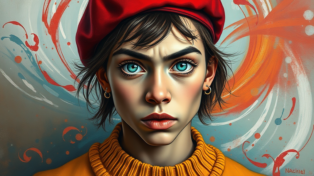 A vibrant portrait painting capturing an expressive individual with striking turquoise eyes, donning a crimson beret and a golden sweater. The dramatic interplay of colors highlights their enigmatic features against a swirling abstract background, infusing the piece with dynamic energy and emotion.