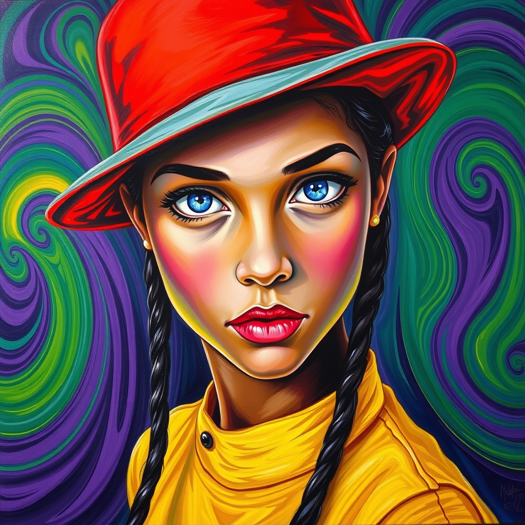 A vibrant portrait painting showcasing an individual with striking blue eyes. The subject is adorned with a crimson hat and a sunlit yellow top. The background flows with swirling patterns of deep purples and emerald greens, emphasizing the bold contrast of the attire. The expression on the face is thoughtful, with a hint of mystery, inviting viewers into a world painted with dramatic, lively colors.