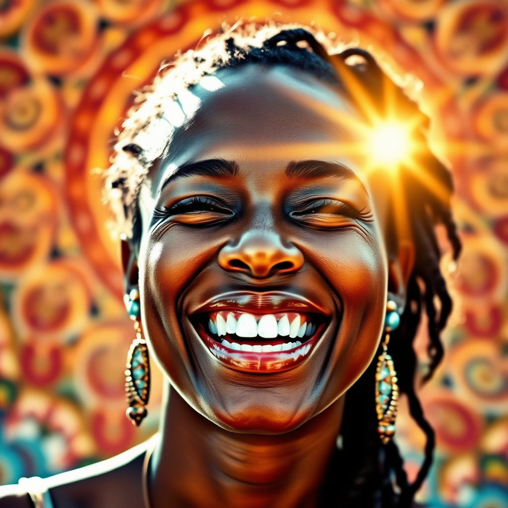 A vibrant portrait with sunshine illuminating a beaming face, joyful laughter resonating around, capturing the essence of a good life; features an intricate background with stunning gradient colors, exquisite details; the subject has earrings, a touch of natural earthiness on their face, and a well-defined nose, all contributing to an artistic composition with high-resolution clarity and sharpness, avoiding any signatures, watermarks, or artist tags, while creating a striking and joyful visual experience.