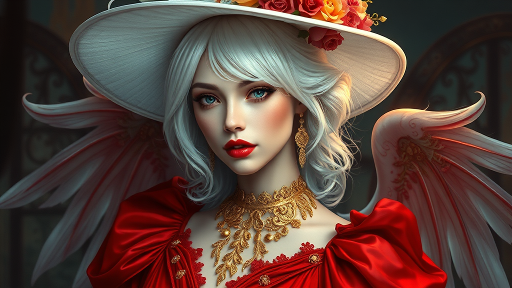 A vibrant portrayal of a woman with striking white hair, adorned in a stunning red dress and a white hat embellished with gold accents. Inspired by artists like Gaston Bussiere, Rutkowski, Mucha, Greg Hildebrandt, and Tim Burton, this digital painting embodies a fusion of dark fantasy and high fashion. The character exudes elegance with gold filigree ornaments gracefully encircling her neckline. She is a goddess-like figure, a Nychosian beauty wearing an elaborate crown of flowers, set against a mysterious and atmospheric backdrop. The composition is reminiscent of an award-winning magazine cover, with hyper-realistic details and a dramatic play of light and shadow. The artwork, rendered exquisitely in 4K using techniques akin to octane render and Unreal Engine, captures the essence of grace and allure with cinematic precision.