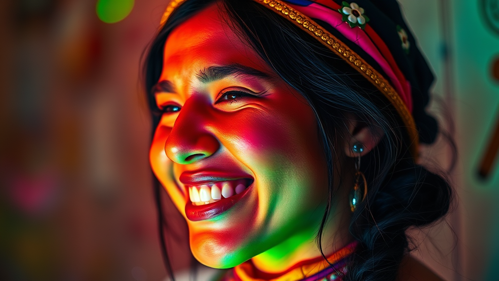 A vibrant portrayal of a young Mapuche woman, her mind alive with passion and joy, exuding a quirky and dynamic energy, enveloped in a palette of pastel hues. The scene is illuminated with delicate light painting, enhanced by bokeh effects and the magic of hyperspectral imagery. Captured through a telephoto lens, the image bursts with electric and fluorescent colors, framed with the cinematic touch of film lighting. A hint of dust and the spark of electricity add texture, all refined through expert post-processing, while maintaining an aspect ratio of 9:16.