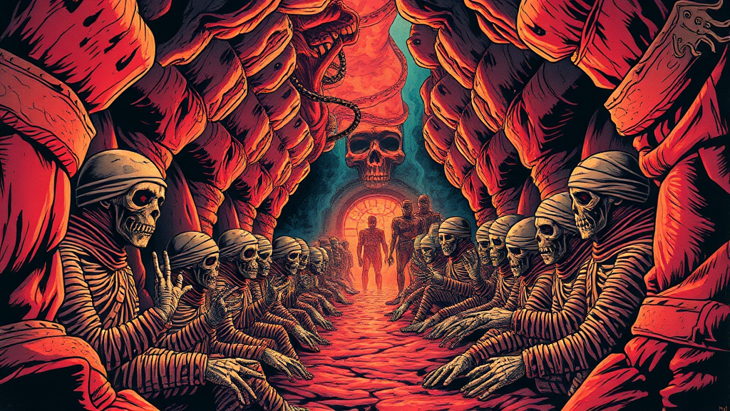 A vibrant poster depicting an adventure through ancient mummies' tombs, infused with the chaotic energy of mommy's on-the-phonecore and classic B-movie aesthetics. The imagery is awash in rich crimson and earthy browns, reminiscent of vintage Marvel comic panels. Distinct framing adds a dynamic edge, while the surreal world of carpetpunk weaves its way through, blending the grotesque with the whimsical. The result is a visual feast where the timeless mystery of the undead meets retro-futuristic allure.