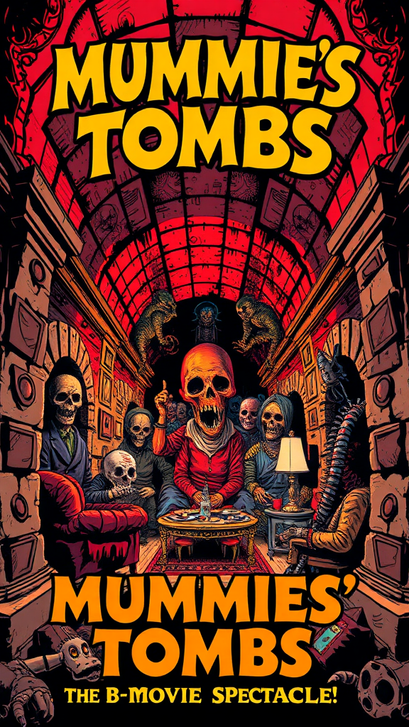 A vibrant poster for "Mummies' Tombs: The B-Movie Spectacle" designed in the eccentric style of mommy's on-the-phonecore, with elements of retro B-movie aesthetics. Featuring a color palette of rich crimson and earthy brown, the artwork draws inspiration from classic Marvel Comics with bold, distinct framing. The scene is set in an imaginative carpetpunk world, where grotesque creatures loom in ornate, labyrinthine tombs. Eerie, yet oddly nostalgic, this composition channels a chaotic blend of vintage horror and surreal domesticity.