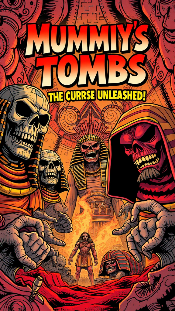 A vibrant poster for "Mummies' Tombs: The Curse Unleashed!" capturing the essence of 'mommy's on-the-phonecore' with a twist of B-movie flair, drenched in crimson and brown hues. Animated with the bold, dynamic lines characteristic of Marvel Comics, each frame distinct and compelling. The background captures a unique blend of carpetpunk textures, offering a tapestry-like setting. Grotesque figures of ancient guardians loom in exaggerated, almost comical menace, their features exaggerated in glorious, outlandish detail. This work beautifully marries vintage cinematic charm with modern comic artistry, creating an irresistible invitation to a thrilling journey into the past!