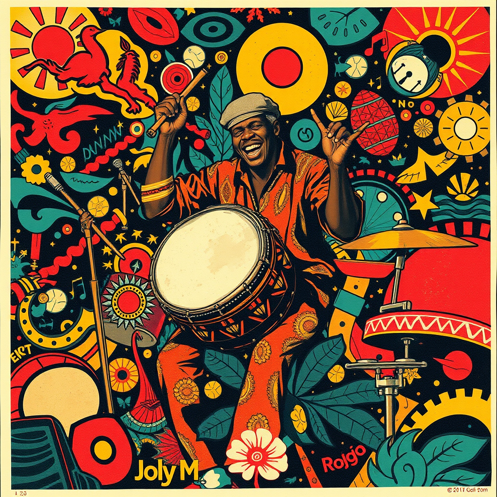 A vibrant poster showcasing a dynamic player passionately beating a drum, surrounded by a whirlwind of mixed patterns and textures inspired by maximalist design. The scene bursts with Americana iconography, seamlessly blending bold symbols with elements of the Black Arts Movement, creating a rich tapestry of cultural significance. The colors are vivid, evoking the warmth and nostalgia of Kodak Gold 200 film, while small touches of frogcore whimsy sneak into the edges, adding a playful twist. The entire composition is rendered with the timeless elegance of a lithograph, the grainy texture accentuating its artistic flair.