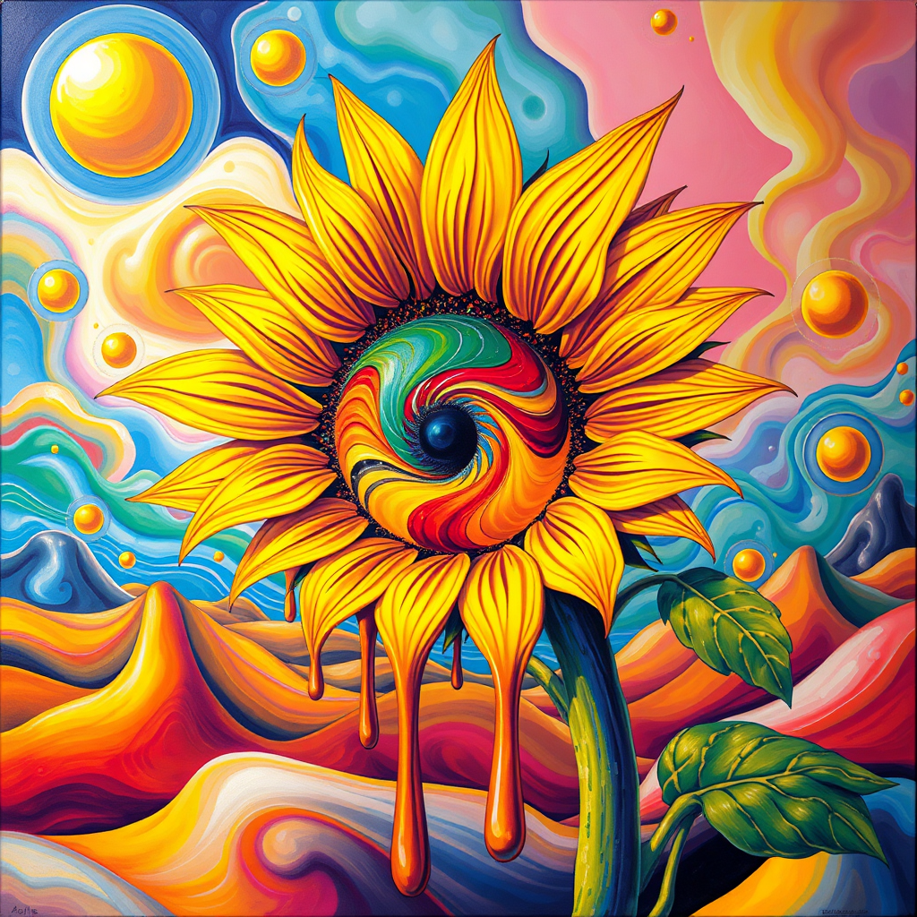 A vibrant, psychedelic painting of a sunflower with surreal elements, its petals appearing to drip and melt like wax in a dreamlike landscape. The scene is infused with the eccentricity of Salvador Dali's elongated forms and the bold, fragmented style of Pablo Picasso. The sunflower's central disk is a swirling vortex of color, with exaggerated, distorted shapes bending around it. The background undulates with soft, fluid forms, enhancing the surreal atmosphere. Bright, contrasting colors dance across the canvas, emphasizing the painting's otherworldly quality, evoking a sense of wonder and curiosity.