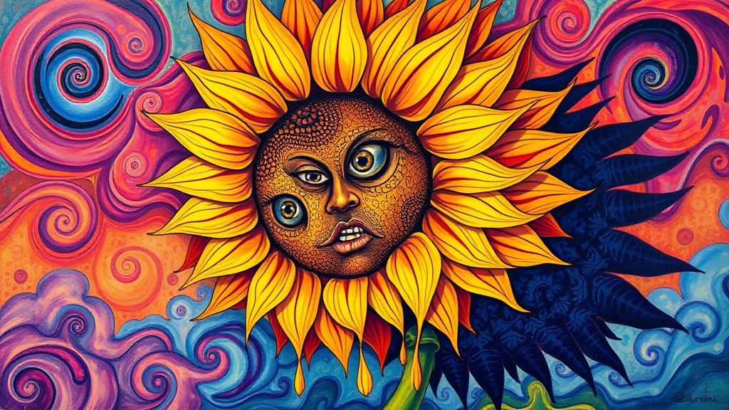A vibrant psychedelic painting of a sunflower with surreal elements, its petals appearing to drip and melt as if influenced by the styles of Salvador Dali and Pablo Picasso. The sunflower's face is distorted, with swirling patterns and abstract shapes intertwining, and elongated shadows stretching across a dreamlike background. The colors are vivid and mesmerizing, creating a sense of motion and fluidity, enhancing the overall surreal atmosphere.