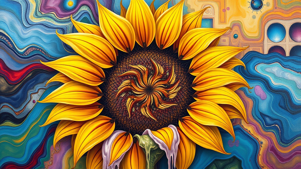 A vibrant, psychedelic surrealist painting of a sunflower, its petals melting and dripping in a dreamlike fashion. The canvas is infused with the essence of Salvador Dali's fluidity and Pablo Picasso's abstract flair, creating a distorted reality where colors blend seamlessly. The sunflower's core swirls into an array of geometric shapes, while the background warps in a fluid, ethereal manner, evoking a sense of otherworldly wonder and distorted perception.