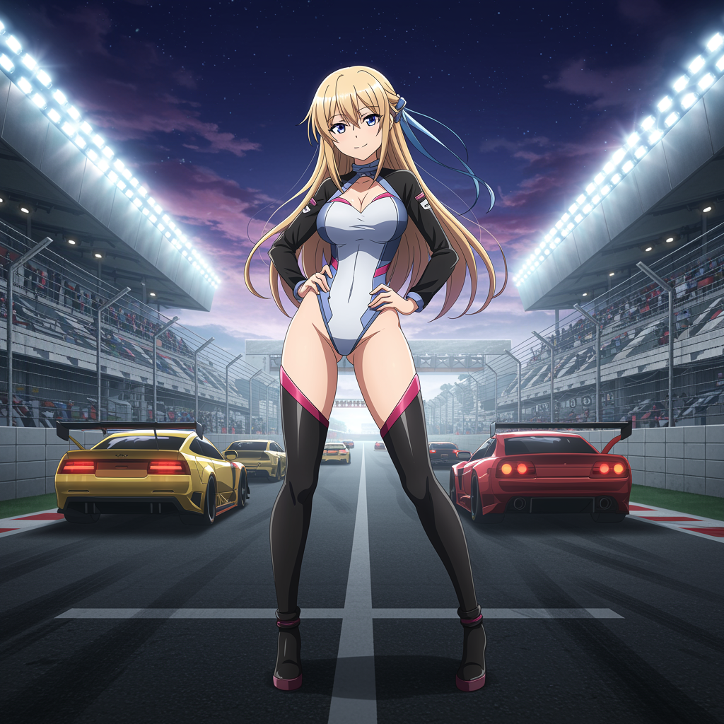 A vibrant racing festival scene featuring a stunning and confident girl of model-like appearance with a flawless figure, long legs, and flowing hair in a sleek, form-fitting racing suit. She stands in a dynamic long shot pose amidst the dramatic, high-contrast lighting of a bustling race track reminiscent of a Redline anime. The atmosphere is energized with the roar of racing cars speeding by, showcasing the craftsmanship of Madhouse style in ultra-high resolution manga graphics. The composition is symmetrical, highlighting the energy and excitement of the event, captured in an 8K super-resolution drawing that immerses the viewer into the first-person perspective of this thrilling world.