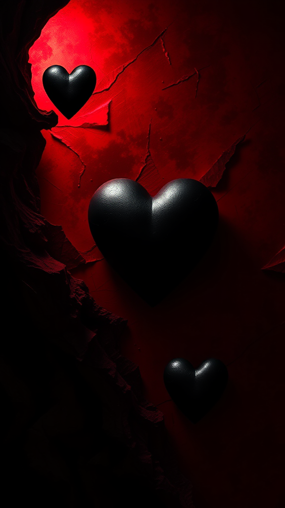 A vibrant red-black gradient background sets the intense mood, featuring a striking black heart nestled in the upper left corner and another in the lower right, illuminated by dynamic lighting that casts dramatic shadows. The scene unfolds with super detailed, complex gothic graphics, embracing the Artstation Unreal Engine 5 color processing trends. It is a masterpiece of detailed matte painting with deep, resonant colors. The fantasy elements are captured through intricate details and a splash of complementary colors, bringing to life a concept reminiscent of a fantasy concept art piece. Rendered in 8k resolution, this creation echoes the essence of a deviantart gothic masterpiece, with subtle creative twists that enhance the overall allure while maintaining the original spirit.
