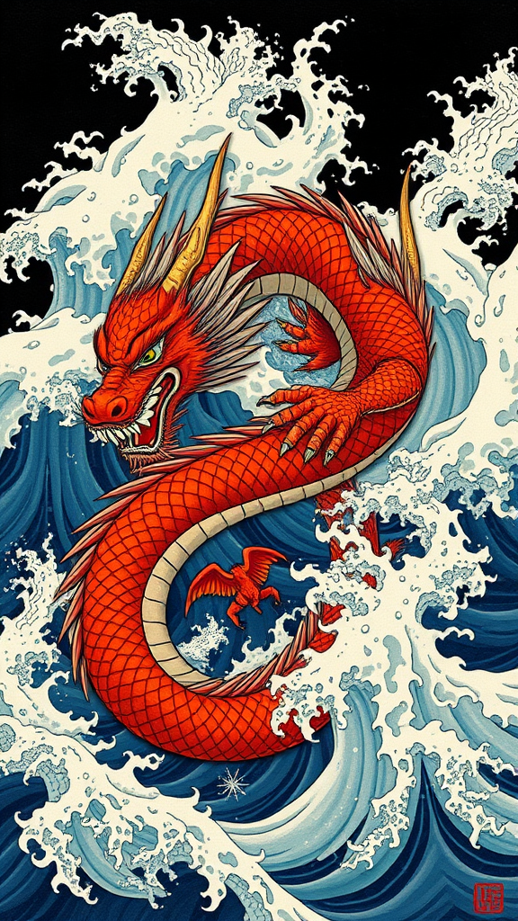 A vibrant red dragon entwined amid tumultuous ocean waves, artfully rendered in a neo-traditional Japanese style reminiscent of Kōji Morimoto. The scene captures the mythical creature in an intense close-up, exhibiting intricate details akin to John Blanche's ornate murals and wall drawings. The setting evokes an absurdist atmosphere, merging elements of Tyler Walpole's dynamic compositions with a surreal edge. The art piece maintains an elongated vertical aspect ratio, emphasizing the dragon's serpentine form and the swirling chaos of the sea.
