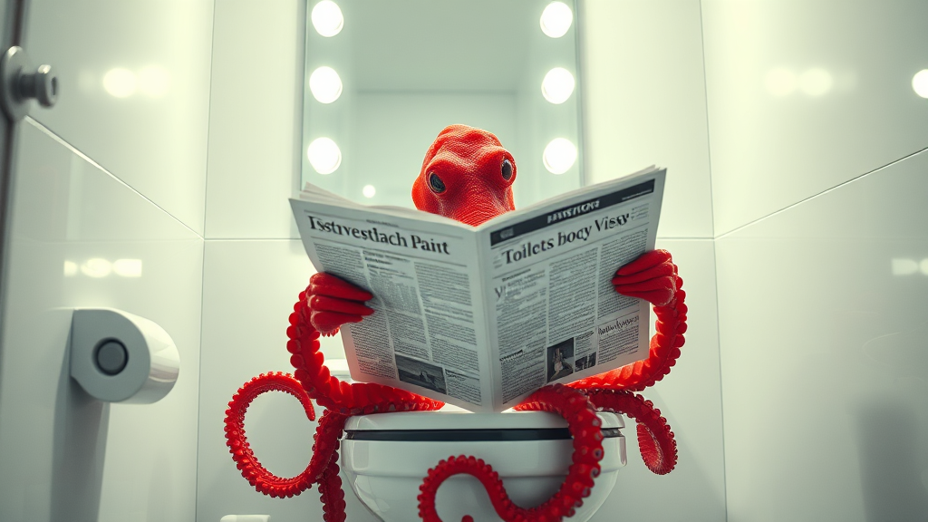 A vibrant red octopus engrossed in a newspaper while perched on a toilet, surrounded by a luminous setting with white tones and a pristine white wall. A mirror behind reflects the scene, and subtle LED and glow lights add a cinematic touch. The hyper-realistic and highly detailed environment embraces bright, soft lighting, ensuring an absence of dark tones, capturing a surreal yet whimsical moment.