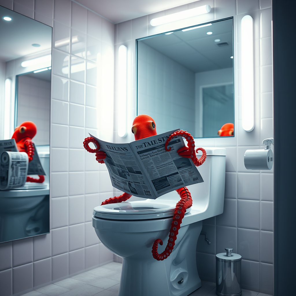 A vibrant red octopus engrossed in reading a newspaper while perched on a sleek toilet, surrounded by an ambiance of bright white lights and tones. The backdrop features white walls with a mirror reflecting the scene, enhanced by LED and glow lights creating a hyper-realistic, photo-realistic effect. The setting exudes cinematic lighting with intricate details, ensuring a bright atmosphere without dark tones, capturing a unique moment in a vertical, 2:3 aspect ratio.