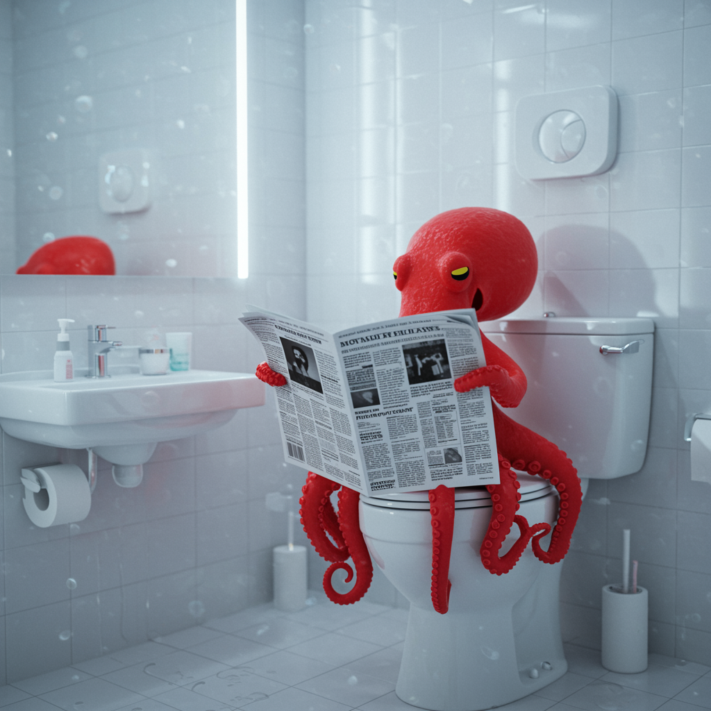 A vibrant red octopus engrossed in reading a newspaper sits atop a pristine white toilet, enveloped by a room bathed in soft, glowing white lights. The ambiance is bright, with cool white tones dominating the minimalist space. Behind it, a mirror reflects the scene, enhancing the luminosity and giving the setting depth. LED and glow lights add a modern touch, casting cinematic shadows and ensuring every detail of the octopus and its surroundings stands out in hyper-realistic clarity. The scene remains devoid of dark tones, capturing a crisp, clean, and strikingly detailed image.