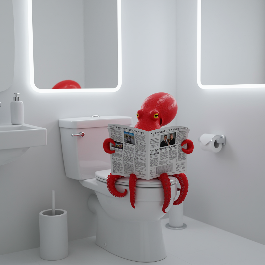 A vibrant red octopus gracefully perched on a sleek modern toilet, engrossed in reading a newspaper, surrounded by an ambiance of luminous white lights and soft white tones. The scene is set against a pristine white wall, complemented by a large mirror reflecting the octopus’s curious gaze. Subtle LED and glow lights delicately enhance the hyper-realistic, photo-realistic setting, ensuring cinematic lighting with utmost detail. The environment is bright and airy, embracing lightness and clarity.