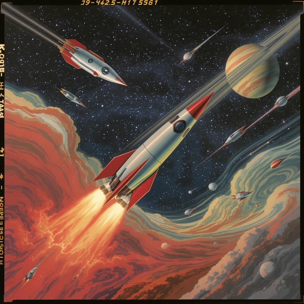 A vibrant, retro-futuristic scene depicting space travel reminiscent of 1950s sci-fi art, with gleaming rockets and sleek spaceships soaring through a starry cosmos. The composition is rich with vivid colors and detailed textures, capturing the spirit of anticipation and wonder. Bold planetary landscapes wreathed in swirling clouds fill the backdrop, while astronauts clad in vintage space suits explore their surroundings. The image is reminiscent of Bruce Pennington's style, characterized by dynamic perspectives and fantastical elements. The scene is captured with a Kodak Master View 8x10 camera using a Fujinon C 240mm f/9 lens, with the rich tones and high resolution of Kodak Ektar 100 film enhancing the dramatic contrasts and vivid hues. The atmosphere is filled with a sense of adventure and the limitless possibilities of space exploration.