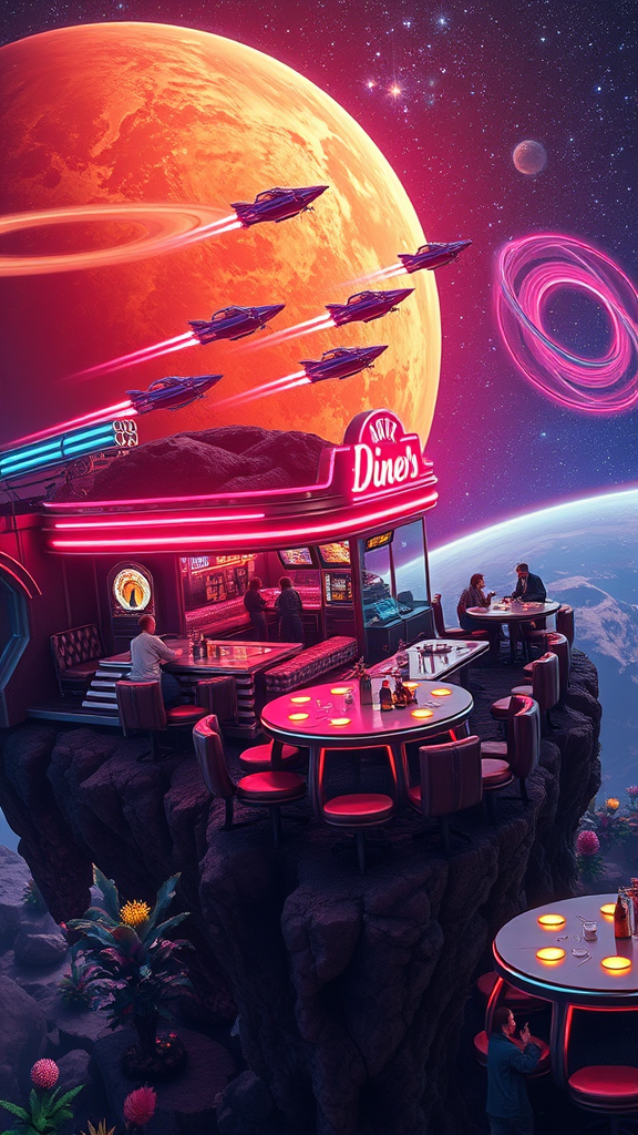A vibrant retro sci-fi scene set in the 1950s-style diner perched on the edge of an asteroid, surrounded by the expansive beauty of space. Flying cars zip by in a dazzling display, their sleek designs casting dynamic, colorful lights across the diner’s neon signs and chrome accents. The asteroid’s surface is dotted with an assortment of exotic alien flora, glowing softly under the star-speckled sky. Inside the diner, the décor reflects the era with curved vinyl booths and checkered floors, yet with futuristic twists like floating trays and holographic menus. The atmosphere is lively, with patrons from different worlds enjoying a cosmic jukebox, while a panorama of swirling nebulae and vibrant planetary rings forms an awe-inspiring backdrop, all captured in intricate 4K detail.